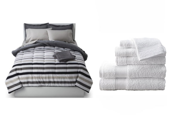 The bedding & Towels package includes: 2 pillows, 2 pillow slips, 1 blanket, 2 flat sheet, 2 bath towels, 2 face towels, 2 face cloths, 1 dish towel, 1 dish cloth